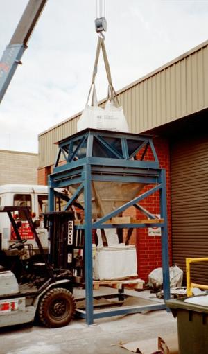 RS232C RT4 can be customised to suit other types of batching plants or production systems wherever Flow Force weight controllers are used and a PC is available. The project also required a BULK BAG DISCHARGER. This was also supplied by Flow Force and has performed very well. The bottom of the bag is automatically split open as the bag is lowered into the discharger and material discharges in a controlled manner.